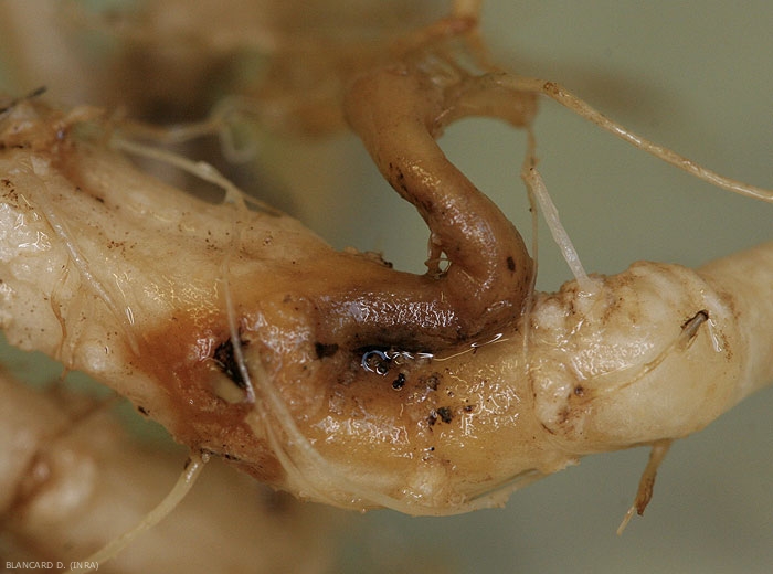 Sur les lésions racinaires, des lignes noires sont observées localement (pseudo-stromas) (figure 8), plus ou moins épaisses et aux contours irréguliers entourant des plages de tissus. Sur certaines portions, on discerne parfois plus difficilement de nombreuses ponctuations noir grisâtre à brun réparties en « mosaïque » en place dans les cellules du cortex. Ce sont les pseudo-microsclérotes (figures 9 et 10) de ce champignon.