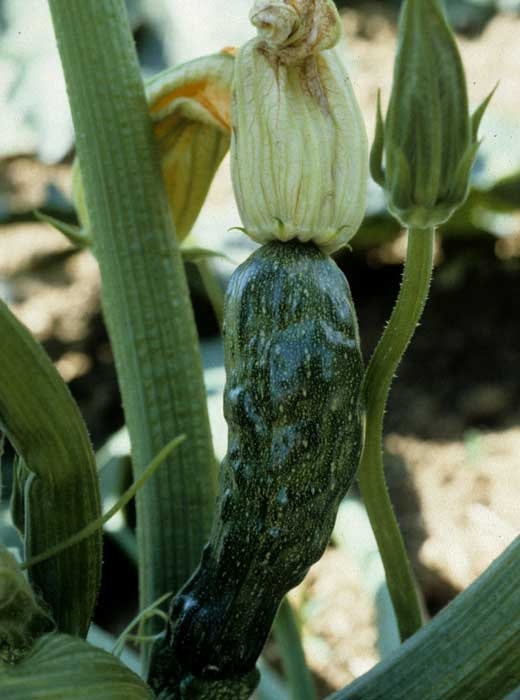 Le virus de la mosaïque de la courgette (Zucchini yellow mosaic virus, ZYMV), de par les nombreuses souches signalées dès la première description de ce virus, est à l'origine de symptômes assez différents. De plus, ceux-ci peuvent varier en intensité en fonction de la saison (ils sont généralement plus sévères en été), l'espèce ou la variété infectée. Notons que des symptômes plus accentués peuvent être observés en cas de co-infection avec d'autres virus (synergie), et en particulier avec le virus de la mosaïque du concombre (CMV). C'est probablement chez la courgette que le ZYMV provoque les symptômes les plus spectaculaires (figures 1 et 7), et c'est souvent chez cet hôte que ce virus a été signalé, initialement, dans de nombreux pays.