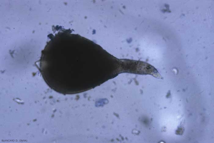 De nombreux oeufs et des larves (figure 3) peuvent être transportés passivement par l'eau de ruissellement, de drainage et d'irrigation à partir des plantes malades. Les larves se déplacent activement sur de courtes distances dans les sols humides. Des disséminations sont possibles via des poussières d'un sol contaminé emportées par le vent vers des parcelles voisines. Les plants contaminés, les outils aratoires et les engins assurent aussi cette fonction.