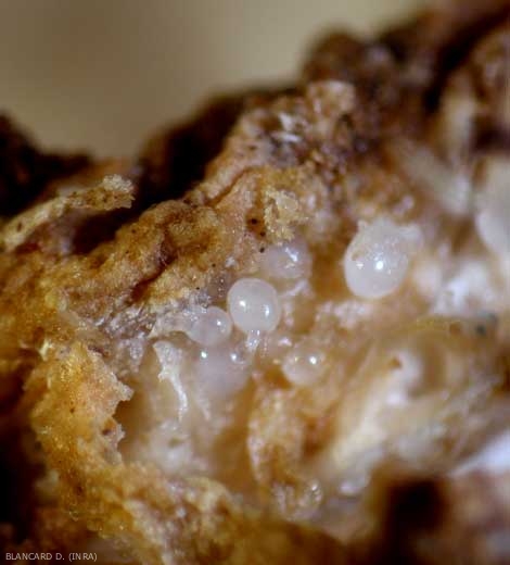 Les Meloidogyne spp. persistent dans le sol plus de deux années, sous la forme de masses d'oeufs protégées par une gangue mucilagineuse blanche à brune qui peut être aperçue à la surface des galles grâce à une loupe binoculaire.
