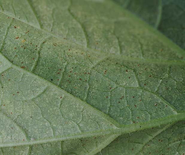 Détail de lésions chlorotiques à la face inférieure du limbe et présence d'acariens.<i><b>Tetranychus urticae</b></i> (tetranique tisserand)