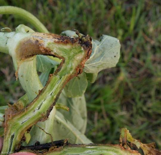 Altération d'abord humide, puis marron foncé, couvrant une portion importante de cette tige de melon. Il faut noter la grande quantité d'exsudats gommeux et les petits points noirs (périthèces ou pycnides) sur cette dernière. </b><i>Didymella bryoniae</i></b>