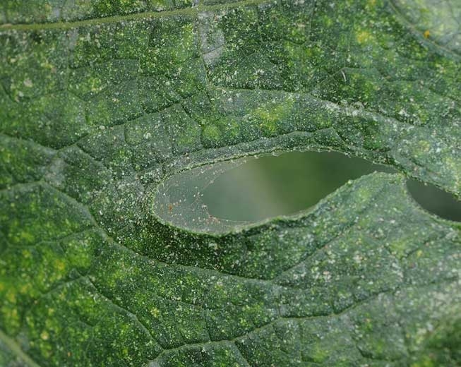 De discrètes toiles se sont formées à la périphérie de cette feuille de courgette chlorotique et aux reflets métalliques. <i><b>Tetranychus urticae</b></i> (tetranique tisserand)