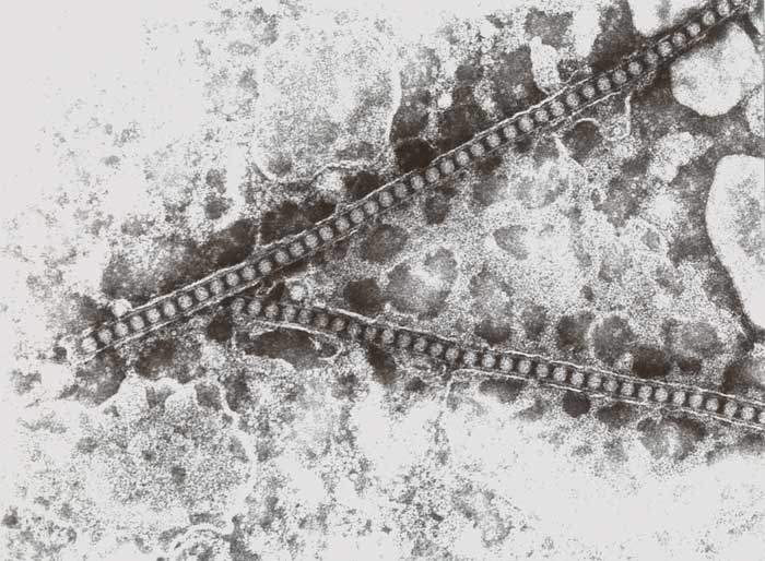 Les particules virales du <b>virus des taches en anneaux du tabac</b> (<i>Tobacco ring spot virus</i>, TRSV) sont polyédriques, de 28 à 30 nm de diamètre.