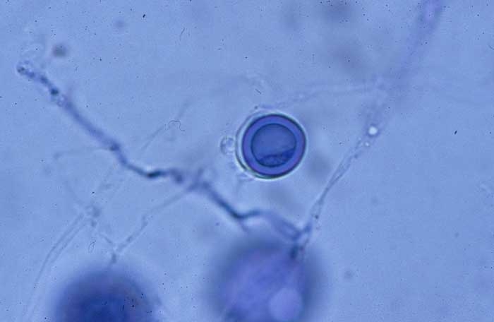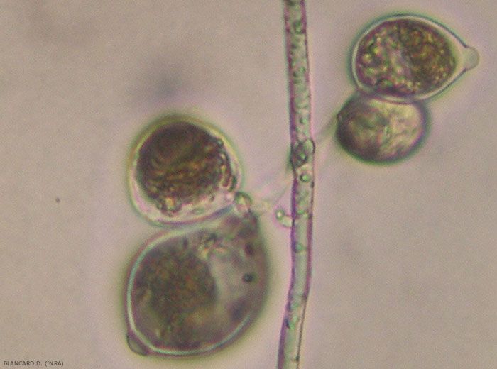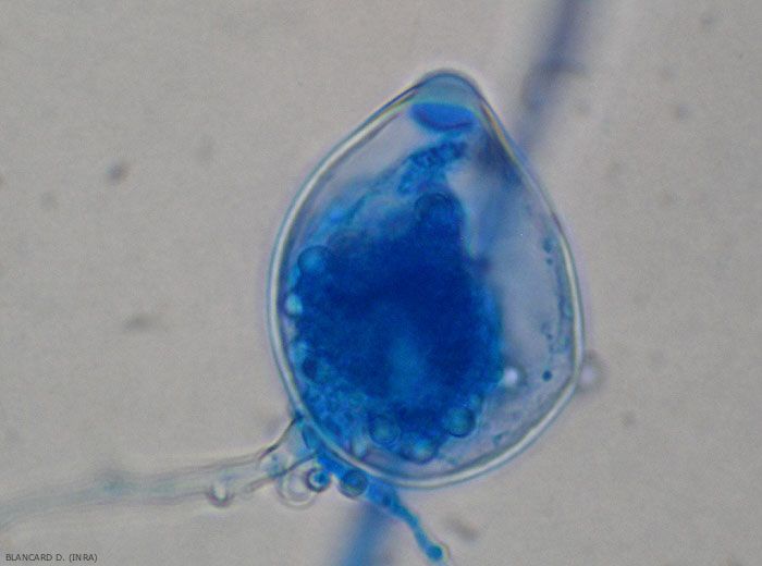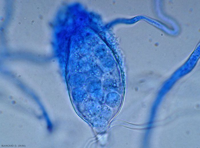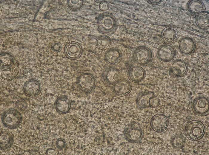 - Présence de sporanges, d'oospores et/ou de chlamydospores dans et parfois sur les tissus altérés.