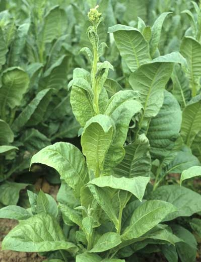 - différents virus comme le Virus de la maladie bronzée de la tomate (Tomato spotted wilt virus, TSWV), le Virus de la mosaïque du concombre (figures 2, 3 et 4) (Cucumber mosaic virus, CMV), le Virus de la mosaïque de la luzerne (figure 5) (Alfafa mosaic virus, AMV), le Virus Y de la pomme de terre (Potato virus Y, PVY), le Virus de la mosaïque du tabac (Tobacco mosaic virus, TMV), le Virus des taches en anneaux du tabac (Tobacco ring spot virus, TRSV), ainsi que d'autres virus (TLCV, BCTV, TRV, TStV...) pour lesquels vous trouverez quelques informations dans la fiche Autres virus parasites du tabac ;