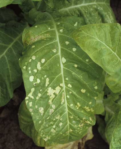 La maladie parasitaire la plus courante est due à Peronospora hyoscyami f.sp. tabacina (considéré autrefois comme un champignon, maintenant appartenant aux stramenopiles), responsable du mildiou du tabac ou "blue mold" (figure 1). Soulignons que le tabac est très sensible à cet agent pathogène à tous les stades de sa culture et que sa présence se caractérise par un velouté bleu se développant sur les taches.