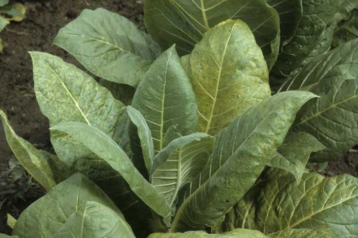 Dans le cas du complexe viral affectant les tabacs de type Burley aux USA (figure 3), on retrouve beaucoup de symptômes provoqués par le TEV et le TVMV individuellement. De nombreuses taches nécrotiques disposées le long des nervures, la présence de brunissements nervaires, le rabougrissement de certaines plantes, le caractérisent. D'autre virus interviennent parfois dans ce complexe, mais moins fréquemment.