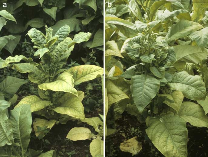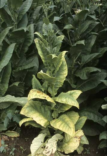 En général, le stolbur commence à se manifester dans le courant du mois d'août, à l'approche de la floraison des tabacs. A ce moment de la culture, les tabacs sont écimés et les bourgeons axillaires sont inhibés chimiquement. La maladie se traduit alors par l'apparition de jaunissements d'abord entre les nervures survenant le plus souvent sur les vieilles feuilles ou les feuilles intermédiaires et gagnant progressivement l'ensemble de la plante (figures 1 et 2). Dans le cas des tabacs bruns, des nécroses nervaires et inter-nervaires accompagnent parfois une légère chlorose du limbe ; le syndrome obtenu peut être confondu avec celui provoqué par certaines souches nécrotiques de PVY (figure 3). Par la suite, la décoloration est telle que le limbe devient totalement blanc. Ce symptôme est peut-être à l'origine de ce que les anciens tabaculteurs observaient parfois et dénommaient les "pieds blancs" (figure 4). Cette anomalie de coloration n'est pas le symptôme le plus caractéristique ; par contre, elle a pu être à l'origine de nombreuses confusions avec ceux occasionnés par des désordres nutritionnels.