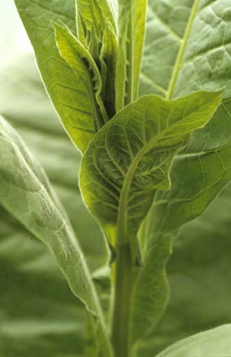 - le virus de la gravure du tabac (Tobacco etch virus, TEV) qui est un Potyvirus comme le PVY. On observe sur les jeunes feuilles un éclaircissement du limbe ("vein clearing"), une marbrure, des arabesques nécrotiques, des taches chlorotiques internervaires devenant nécrotiques, ainsi que des nécroses des nervures des feuilles basses (figure 5). On peut aussi parfois observer un rabougrissement des plantes. Plusieurs espèces de pucerons (Myzus persicae, Myzus nicotianae, Macrosiphum spp....) transmettent ce virus selon le mode non persistant (Virus de la gravure du tabac).