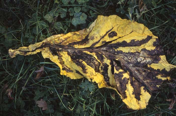 Elle survient aussi en cours de séchage, comme Pectobacterium chrysanthemi. Les feuilles affectées présentent une altération humide et noire s'initiant à partir du pétiole, gagnant progressivement les nervures et les tissus inter-nervaires (figure 4).