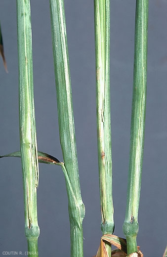 Les parties du chaume au-dessus du noeud enflent, les chaumes restent courts et se cassent facilement aux endroits endommagés. Les épis des chaumes endommagées restent le plus souvent ancrés dans la gaine et produisent des grains atrophiés (figure 2).