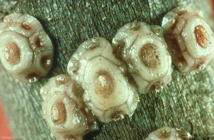 L'adulte est ailé (une seule paire d'ailes), mobile, et dépourvu de protection cireuse. La femelle adulte présente un bouclier ovalaire (4 à 5 x 3 à 4 mm), épais, globuleux, formé de 8 plaques tégumentaires fusionnées, de couleur brun clair (figure 1).