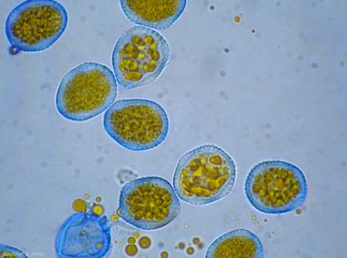 Ces écidiopsores vont se disperser sur la surface de la feuille puis germer et pénétrer les tissus. La sporulation aboutit à la formation des urédosores orangés qui produisent des urédospores (figure 1) mesurant 20-28 X 15-22 µm et accompagnées de paraphyses. La membrane de ces urédospores, d'une épaisseur de 2-2,5 µm, est finement verruqueuse et percée de 6 à 10 pores germinatifs (figure 2).