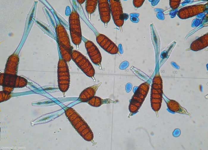 En fin de cycle végétatif, le dernier stade aboutit à la formation de téleutosores produisant des téleutospores (figure 3). Chacune d'entre elles comporte 3 à 8 loges avec la loge supérieure prolongée par une papille hyaline ou peu colorée. Cette papille a une longueur qui peut atteindre 20 µm. Le pédicelle qui est hyalin est renflé en massue à sa base.