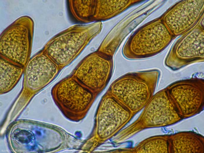 Lorsque la plante hôte est mature, les sores produisent des spores de nature différentes : les téleutospores (figure 3). Ces spores sont pédicellées et de couleur noire. La teinte brune des téleutospores justifie le fait que la rouille des céréales, causée par Puccinia graminis, soit qualifiée de rouille noire.