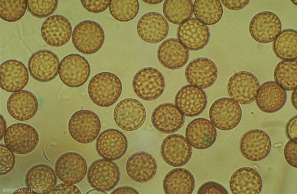 Les écidiospores, produites par les écidies (figure 4) sont polyédriques ou arrondies et leur diamètre varie de 12 à 16 µm. Leur membrane est mince, finement ciliée et transparente.