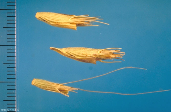 Inflorescence : épi de 4 à 6 cm de long comprenant 4 à 7 épillets (figure 3). Chaque épillet comprend 3 à 4 fleurs vertes, pâles et un peu glauques. Glumes oblongues non ventrues avec 2 à 3 arêtes. La déhiscence se produit au noeud de l'épillet fertile basal (figure 4).
