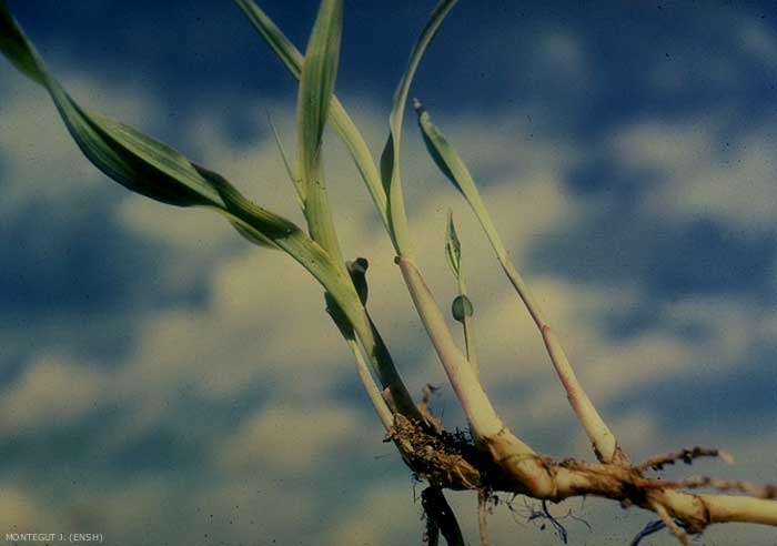Feuilles larges de 1 à 2 cm, planes, scabres, à nervure médiane épaisse, blanche non proéminente, pilosité dense appliquée à la base de la feuille. Au delà du stade 3 feuilles gaine progressivement aplatie ;