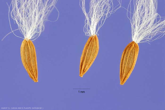 Forme : fusoïde aplani en 2 faces planes. Aigrette sessile à soies lisses, blanches