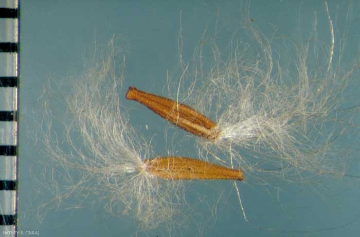 Forme : fusiforme à plus grande largeur dans le tiers supérieur, atténués à la base ; présence d'une aigrette sessile ;