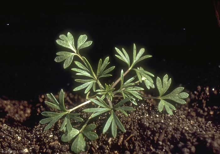 Feuilles inférieures trilobées, disposées en rosette, avec peu de feuilles. Feuilles ultérieures multifide, longuement pétiolées. Feuilles plusieurs fois finement pennées avec des segments étroits et linéaires