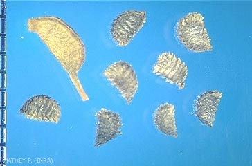 Ornementation : stries constituées de paillettes régulièrement imbriquées en "toit d'ardoises" d'où un toucher rude du fait de la présence de ces écailles et de rides transversales ondulées