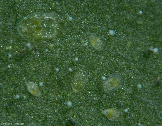 - Stades de développement : les oeufs (figure 2-1 et 2) (figures 4 et 5) sont surtout déposés à la face inférieure des feuilles. De couleur blanche, ils sont ovales et ont un diamètre de 0,25 mm.