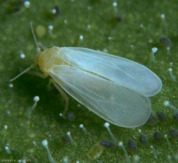 - Formes de conservation et/ou hôtes alternatifs : ces insectes n'ont pas de stade adapté à la phase hivernale. Ils ne se maintiennent que si leurs hôtes ne meurent pas. Notons que les oeufs peuvent subir des températures inférieures à 0°C durant plusieurs jours. Ces aleurodes se maintiennent aisément sur de nombreux hôtes cultivés, mais aussi sur diverses plantes adventices, qu'il conviendra donc d'éliminer soigneusement.