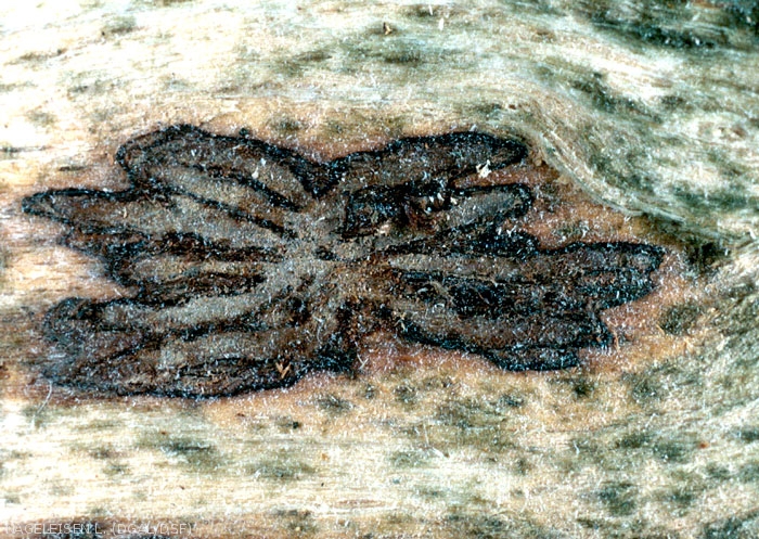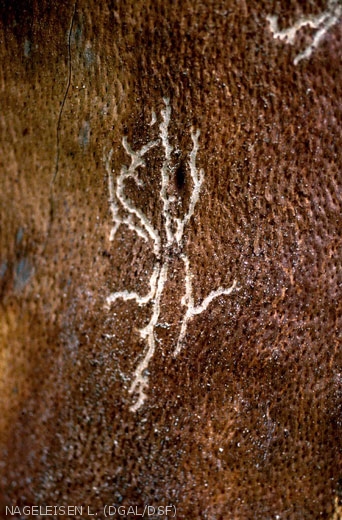 - les galeries larvaires sont irrégulières, entremêlées et forment un véritable réseau entre les bras maternels donnant un aspect confus et peu caractéristique finalement au système.