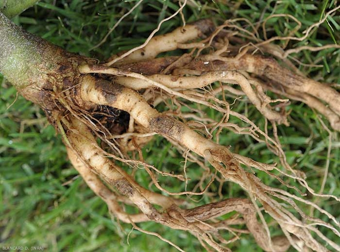 Lors de l’arrachage, des renflements d’aspect brun forment des manchons liégeux caractéristiques, principalement situés sur les grosses racines (figure 4).