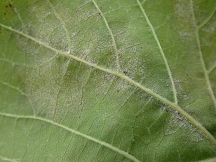 Les foyers primaires initiés sur les feuilles permettent la sporulation du mildiou et la formation dees sporanges (figures 4 à 6). Ces spores sont à l'origine des contaminations secondaires, permettant ainsi la dissémination de la maladie aux autres feuilles et aux ceps voisins.