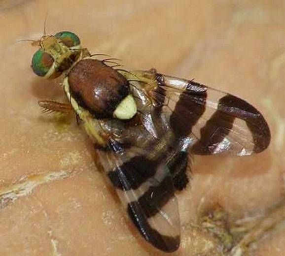 Facilement identifiables, les adultes portent un point jaune caractéristique du genre Rhagoletis en bas du thorax et des ailes transparentes marquées par trois traits noirs épais, dont le dernier est prolongé en forme de L. Les insectes ont des yeux bleu-vert (figure 1).