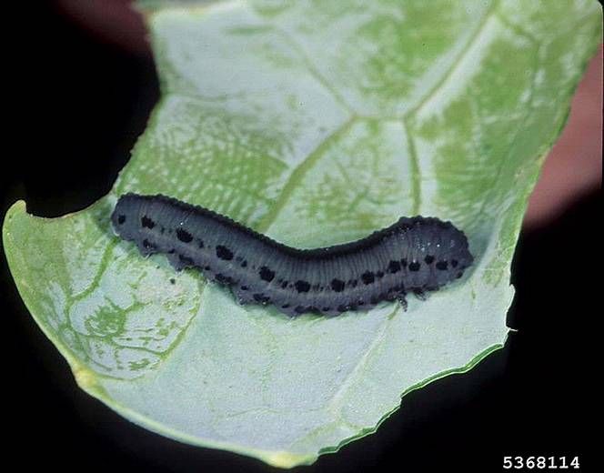 Un troisième ravageur est présent sur le chou, la fausse chenille de la tenthrède (figure 4). Cette larve d’hyménoptère décape la face inférieure des feuilles tandis que les larves plus âgées de couleur foncées, rongent les feuilles à partir de leur face inférieure et du bord, ne laissant en place que les nervures principales. En cas d’infestation forte, la défoliation totale peut avoir lieu. A la fin de son développement elle donne naissance à une petite guêpe de 6 à 8 mm de long, avec un abdomen jaunâtre à orange jaunâtre, une tête et un thorax noir brillant, et des ailes transparentes