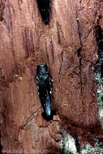 Au printemps, après essaimage, les adultes laissent un trou de sortie ovoïde caractéristique (en forme de D) bien visible à la surface de l’écorce. Enfin, en cas d'attaque massive, on observe des décollements d'écorce et des galeries sinueuses sous-corticales typiquement en zigzag. Sur un arbre peu attaqué, les suintements évoluent en un genre de chancre se cicatrisant en quelques années et laissant des traces internes dans le bois similaire au défaut du T.