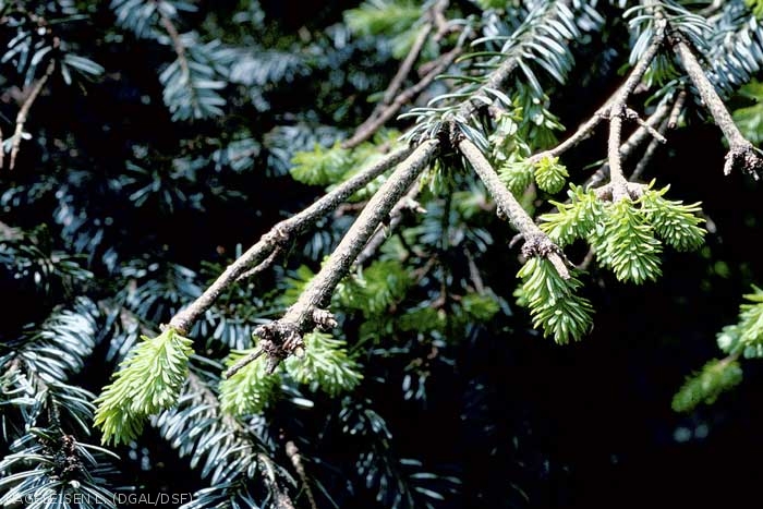 - Attaque antérieure : présence de "fenêtres" sur le rameau qui correspondent à la consommation de toutes les aiguilles d'une année.