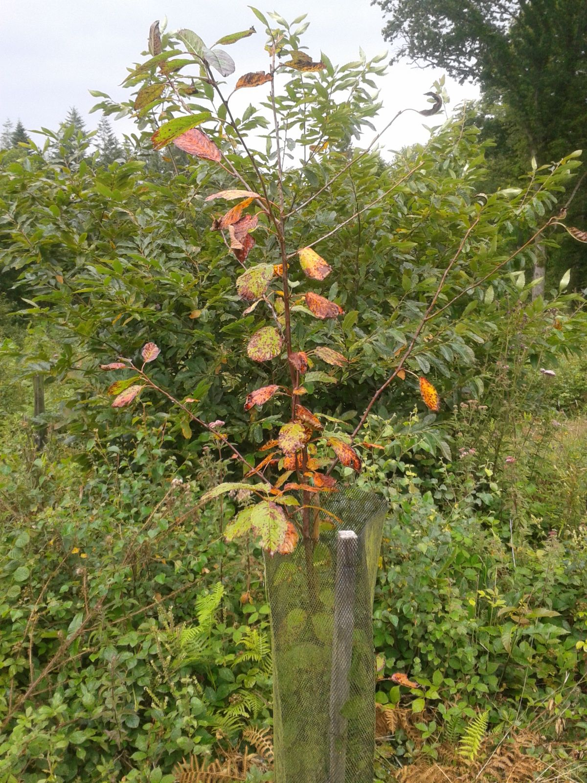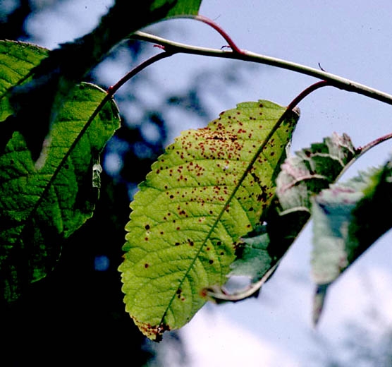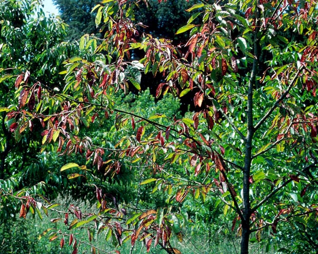 Gnomonia erythrostoma (maladies des taches rouges du cerisier) : les feuilles restent accrochées à l'arbre. Le limbe se replie sur lui-même et le pétiole s'incurve de manière à faire pendre le limbe verticalement par rapport au rameau.