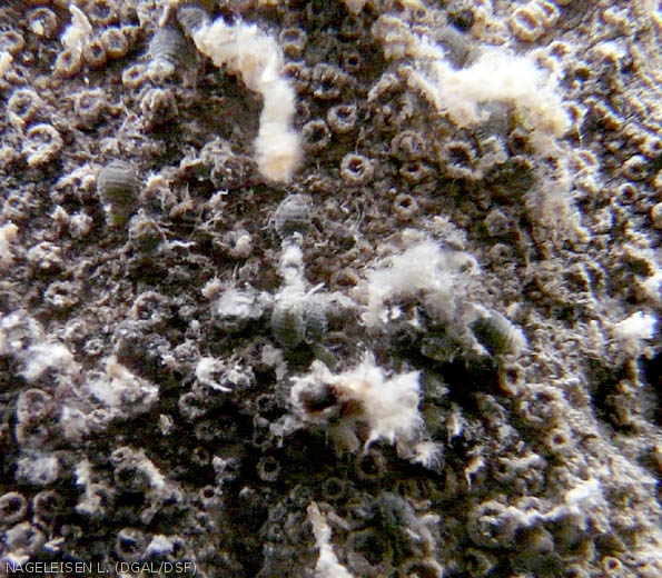 - Les attaques anciennes sont repérables car l’écorce qui a perdu son élasticité se craquelle aux endroits occupés par les anciennes colonies (“ symptômes en peau de lézard ”).
