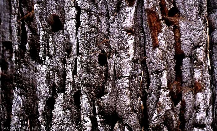 . sur l'écorce : écoulement de sève, présence de sciure brunâtre et jaunâtre qui s'échappe des orifices larvaires ;