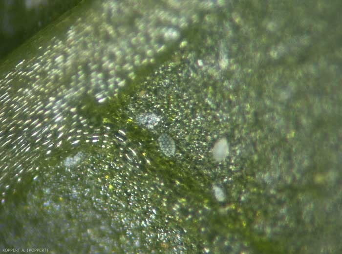 Polyphagotarsonemus latus est principalement rencontré à la face inférieure des jeunes feuilles, où il se cache entre les poils.