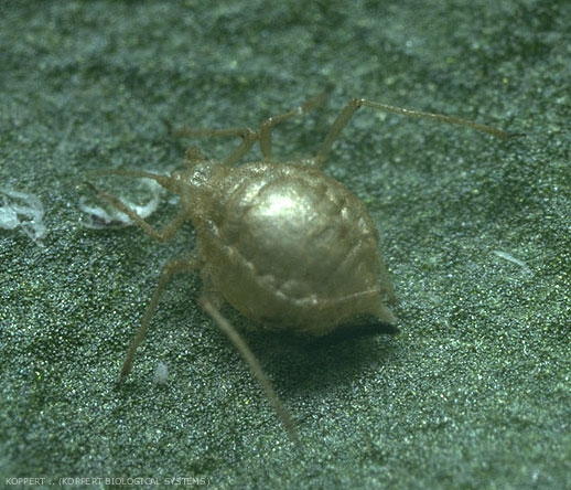 Les pucerons parasités ne meurent pas immédiatement et continuent généralement à se nourrir et à sécréter du miellat (figure 2). Ils sont également toujours capables de transmettre des virus et de donner naissance à de jeunes pucerons pendant encore deux jours. Cependant, un puceron parasité à un stade jeune ne pourra pas se reproduire.