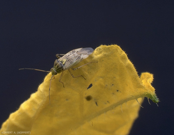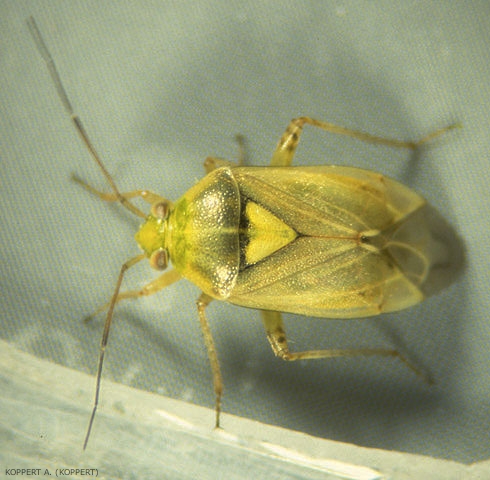 La couleur de la punaise Lygus rugulipennis peut varier du vert clair au marron foncé selon la culture qu’elle occupe. Les femelles sont plus claires que les mâles, qui sont parfois presque noirs. En culture de concombres, les punaises adultes affichent une couleur entre le marron et le vert tendre. L’adulte de Lygus rugulipennis est légèrement plus grand et plus affiné que celui de Liocoris tripustulatis (figures 1 à 3).