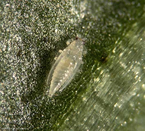 Larves, prénymphes et nymphes : blanches ou jaune clair (figure 3) et préfèrent la face inférieure des feuilles.
