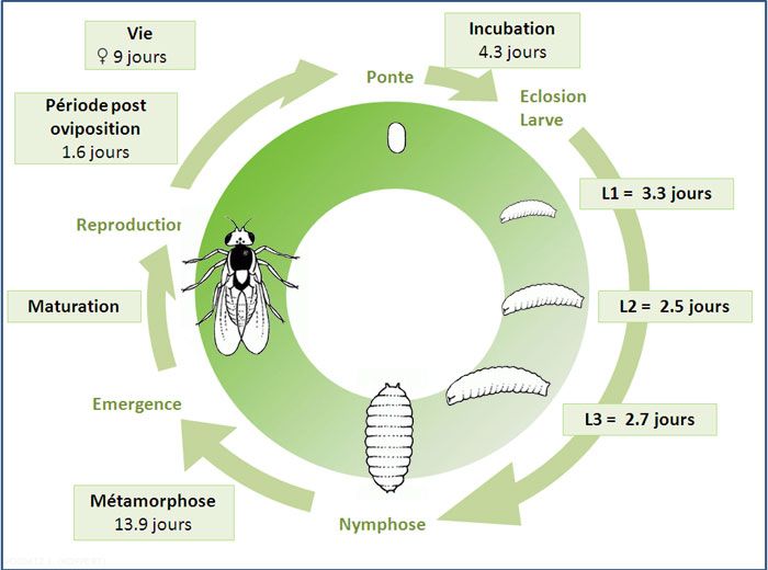 Le seuil de développement se situe entre 8 °C et 10 °C. Au-dessus de 35 °C, l’insecte arrête sa croissance. |