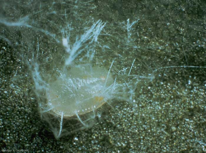 Lorsque les aleurodes sont infectés, ils meurent avant que le champignon n'ait grandi et soit visible. Les larves et les pupariums morts prennent alors une coloration marron et deviennent difformes et ternes.