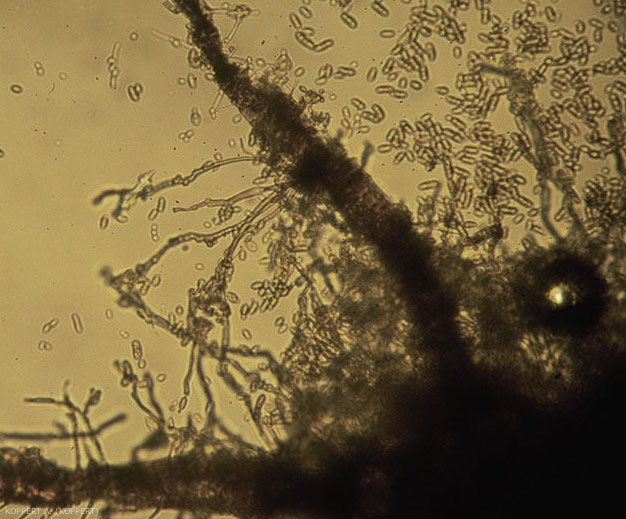 Après avoir pénétré la cuticule de l'insecte, les spores de L. muscarium germent sur l'insecte et on observe des filaments de mycélium (figure 1). Le champignon a une apparence cotonneuse blanche. Leurs extrémités présentent de petits ballons dans lesquels se trouvent une ou plusieurs conidiospores (figures 2), entourées d'une substance collante. Les spores sont ensuite disséminés par par l'eau ou par des actions mécaniques afin d'infecter de nouveaux organismes (figures 3).