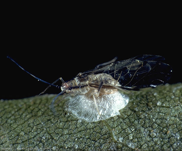 blanche aux téguments transparents (figures 1 et 2), cocon situé sous le puceron "fixé" à la feuille, ce qui forme un socle soyeux. |