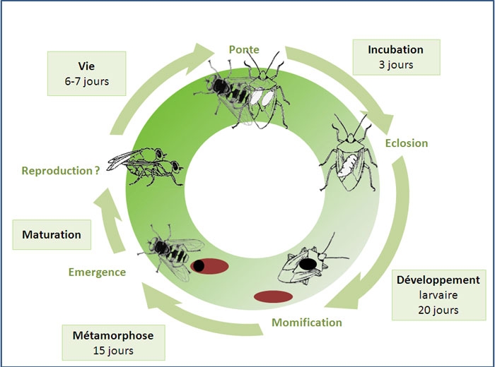 Ci-dessus le cycle de développement de Trichopoda pennipes.