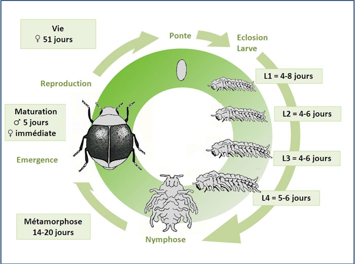 Ci-dessus le cycle de développement de Cryptolaemus montrouzieri.