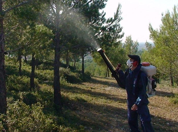 Traitement bactérien réalisé grâce à un canon atomiseur (© INRAE).
